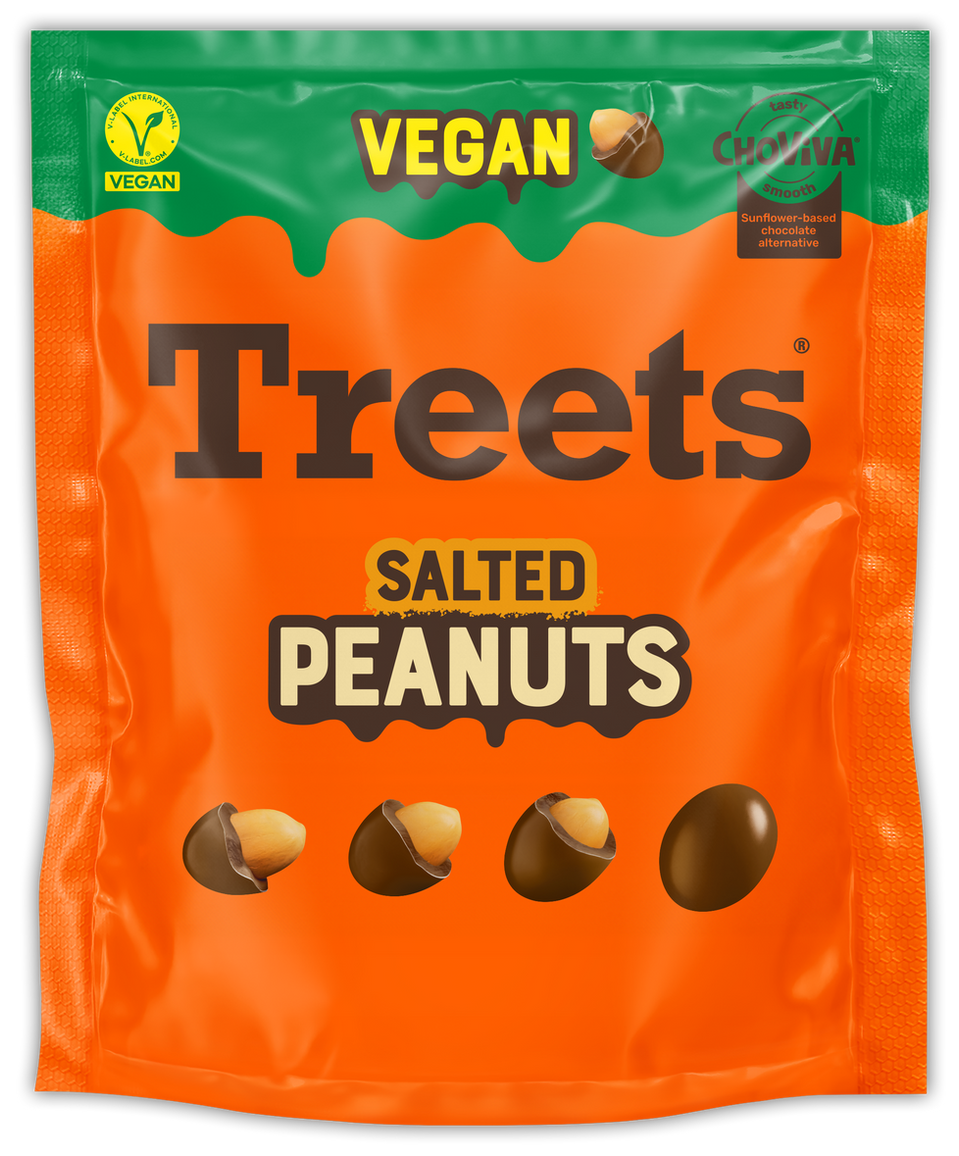 Dragierte, gesalzene Erdnüsse mit 43% Schokoladenalternative auf Sonnenblumenkernbasis und braunem Zuckerüberzug